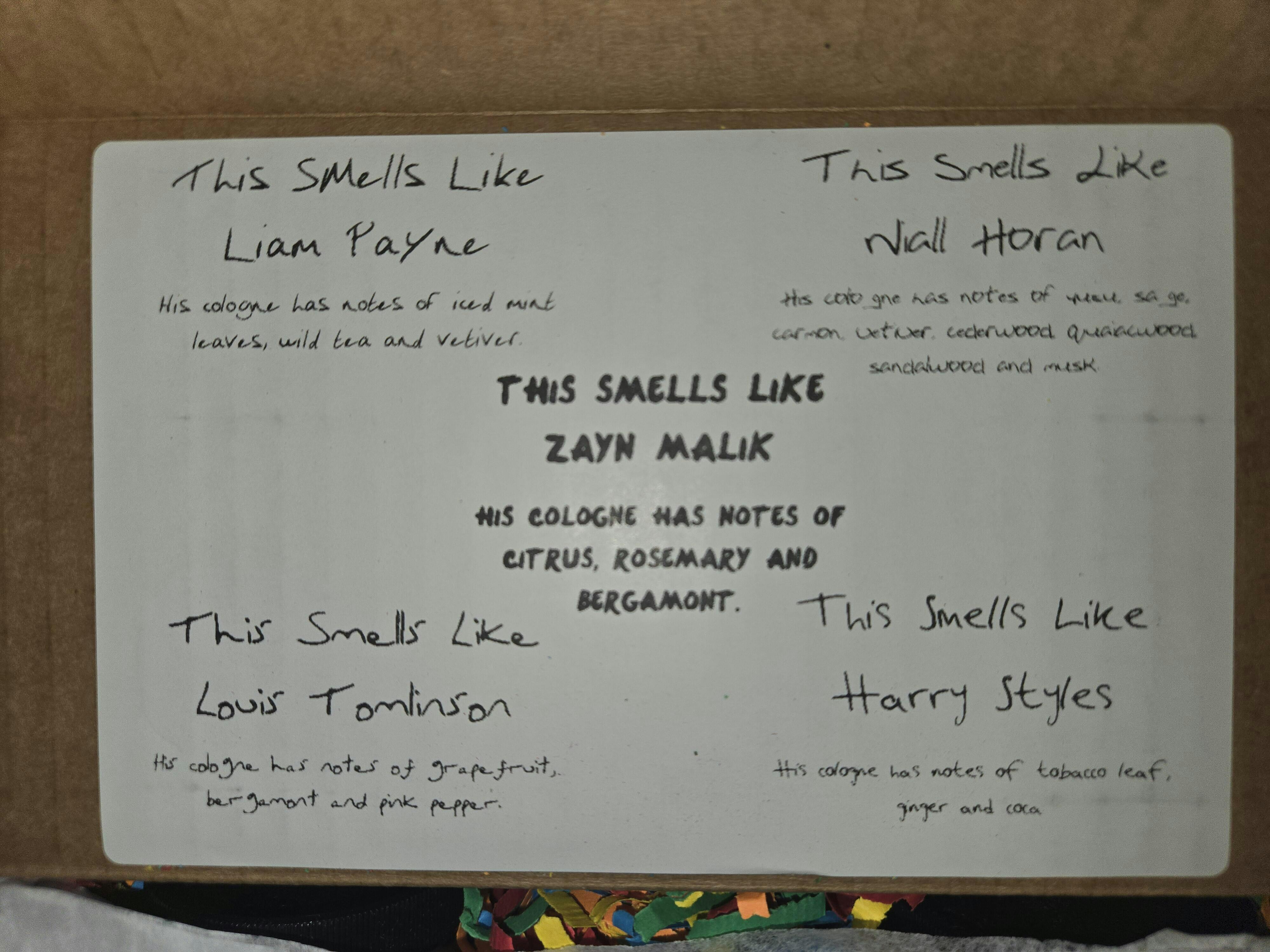 Niall Horan: His cologne has notes of yuzu, sage, Carmon, vetiver, cederwood, quaiacwood, sandalwood and musk.