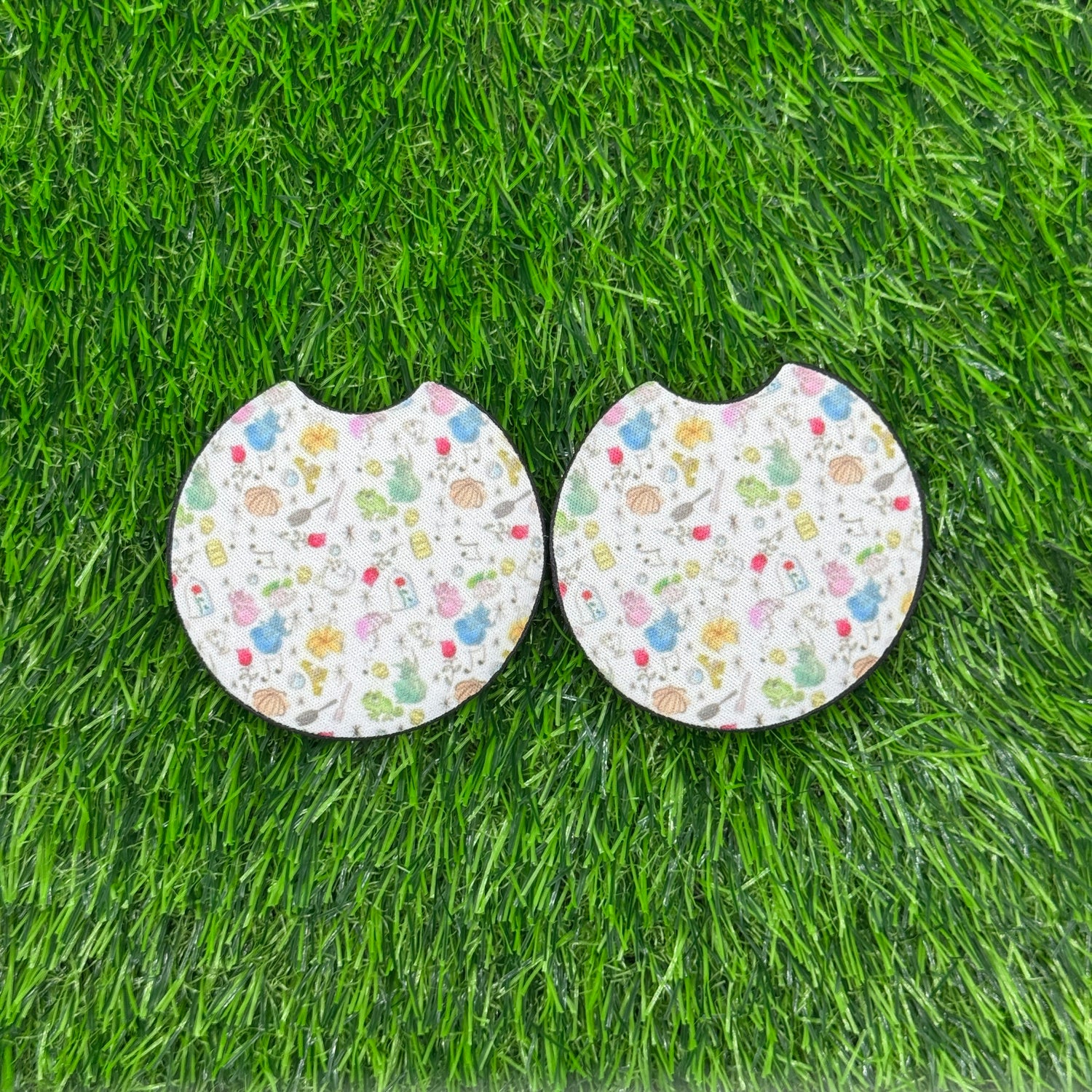 2 neoprene car coasters. They are 2.75 inches and fit most cars.