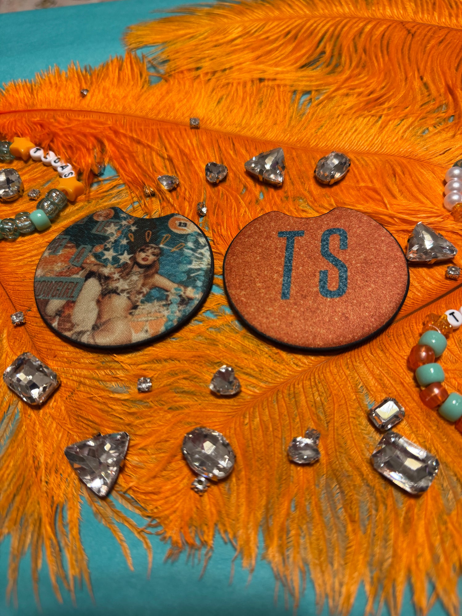 2 neoprene car coasters. They are 2.75 inches and fit most cars.